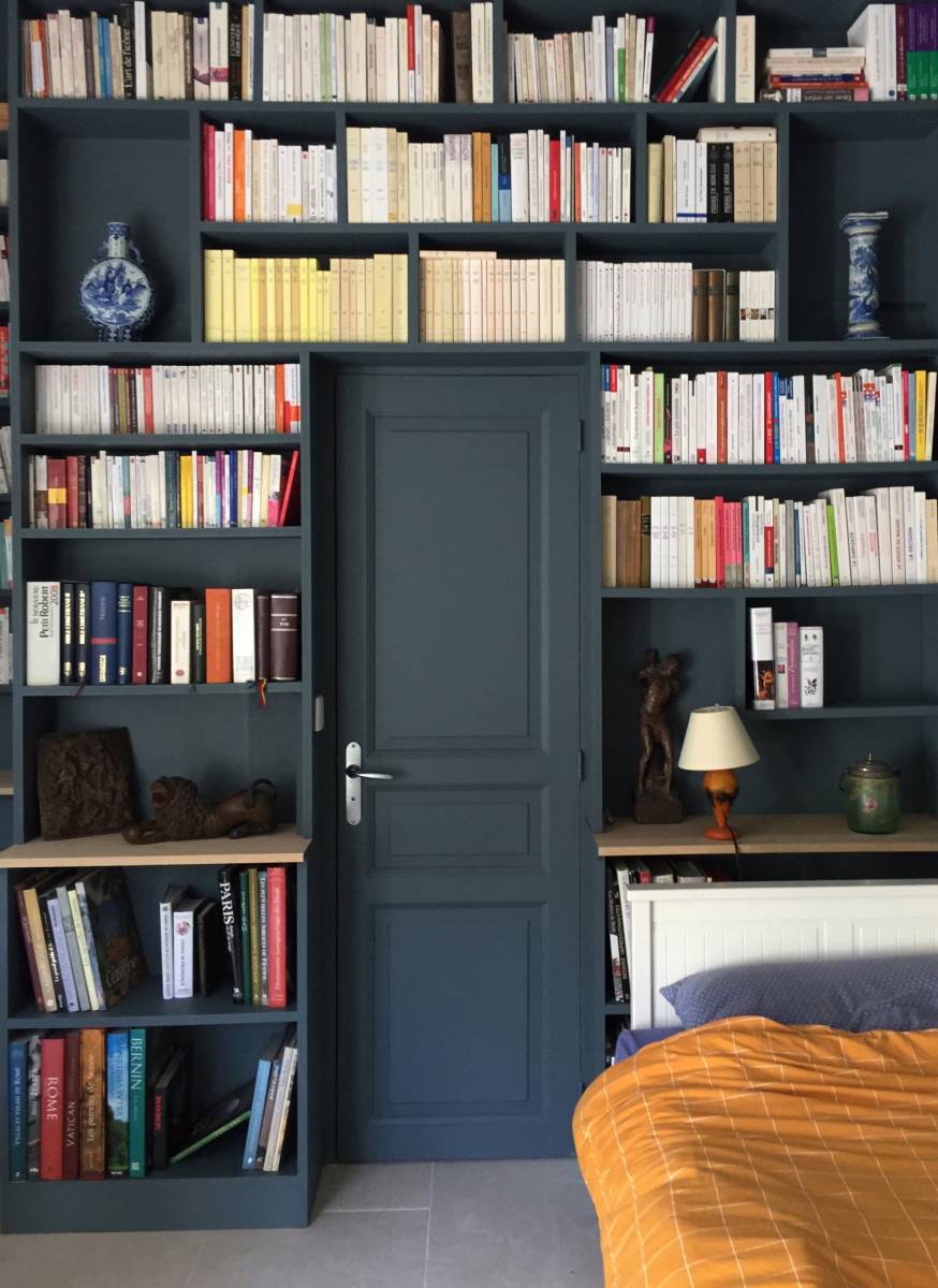 Le rayonnage a été travaillé de manière à travailler sur une asymétrie pour ne pas amener l'ennui visuellement.