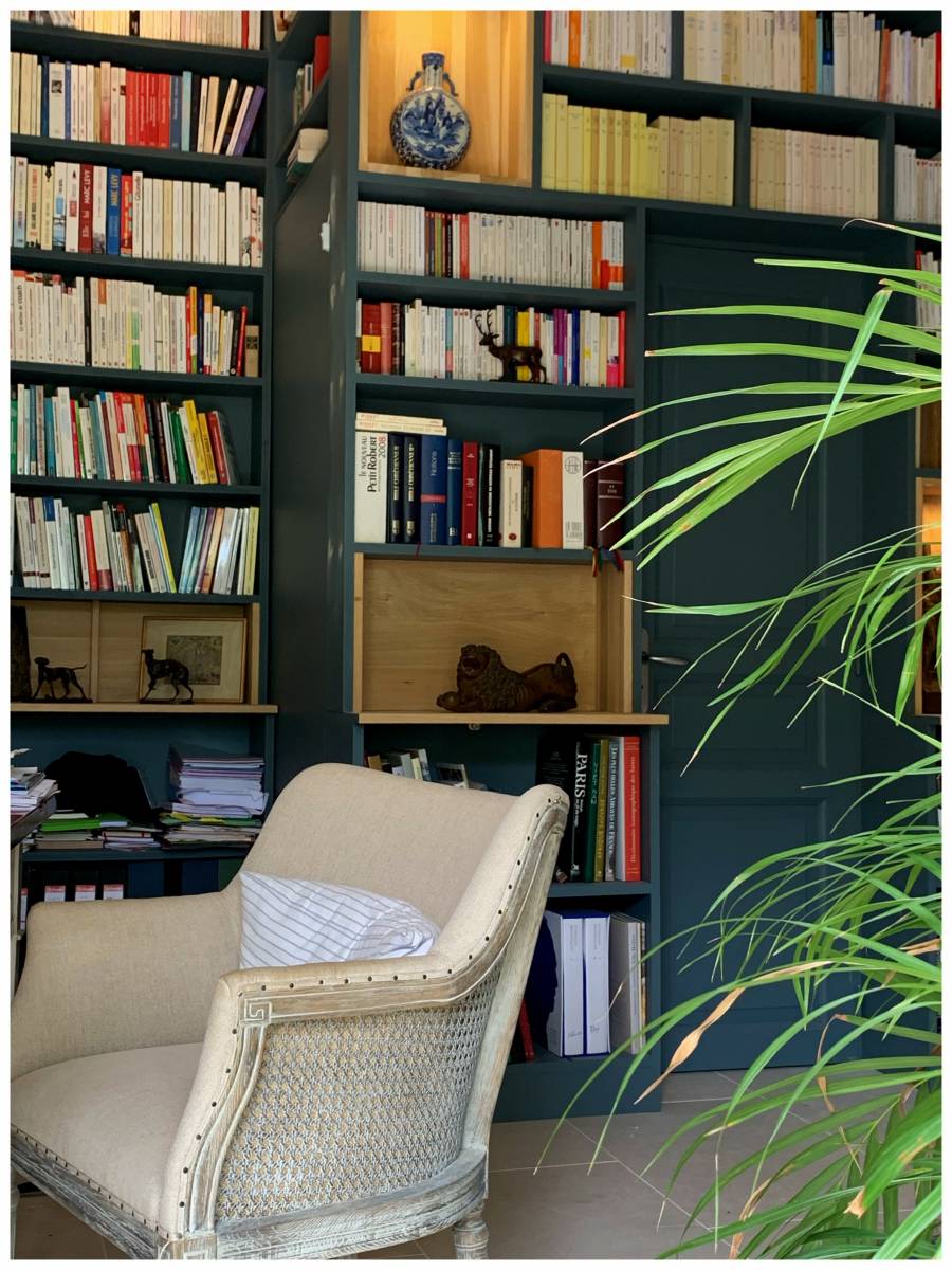 Le mélange de la pierre d'Égypte posée en opus , le chêne naturel de la bibliothèque viennent apporter de la douceur à ce bleu très présent. Les jeux d'opposition et d'association sont essentiels dans l'architecture d'intérieur et dans la décoration