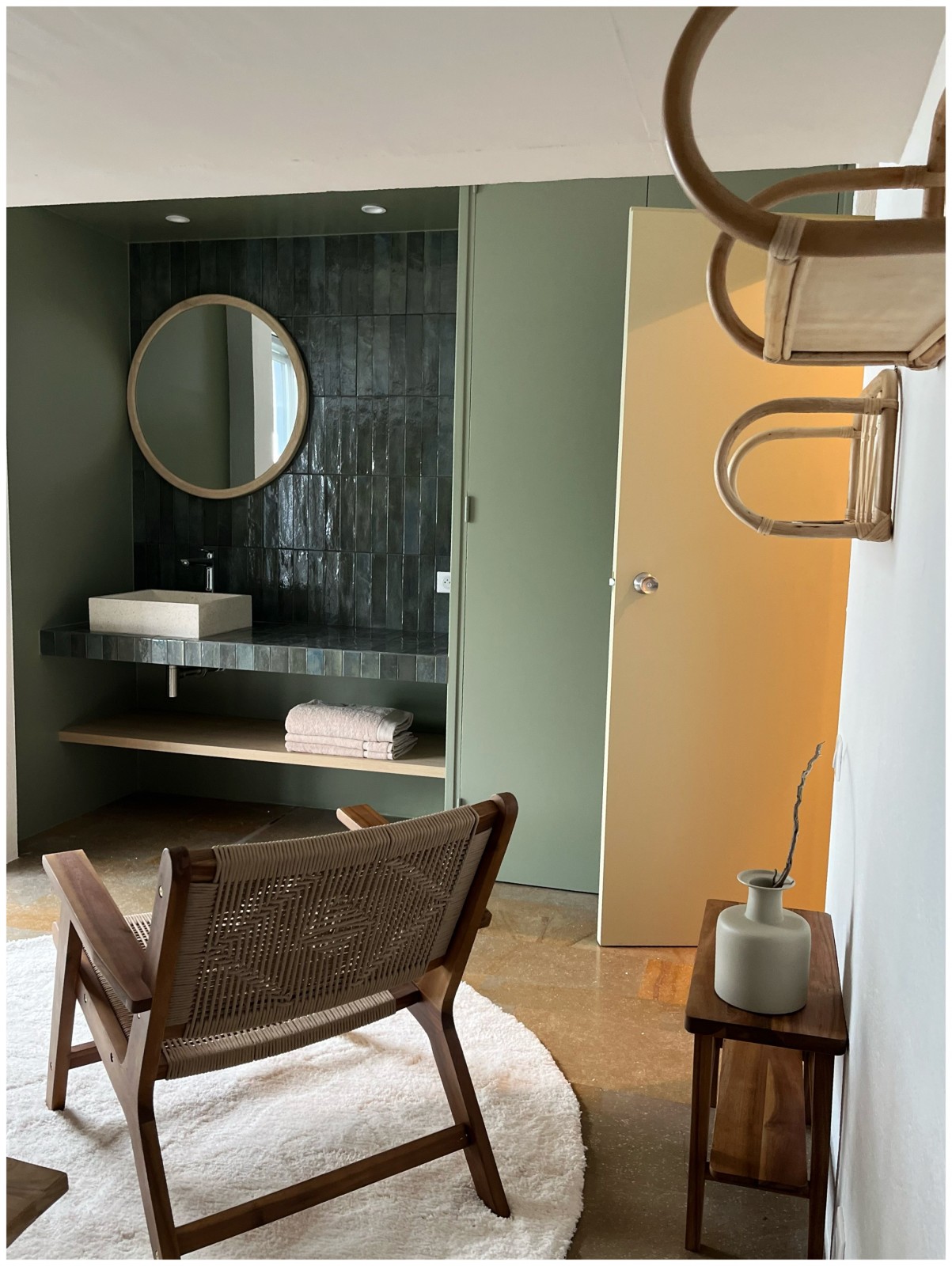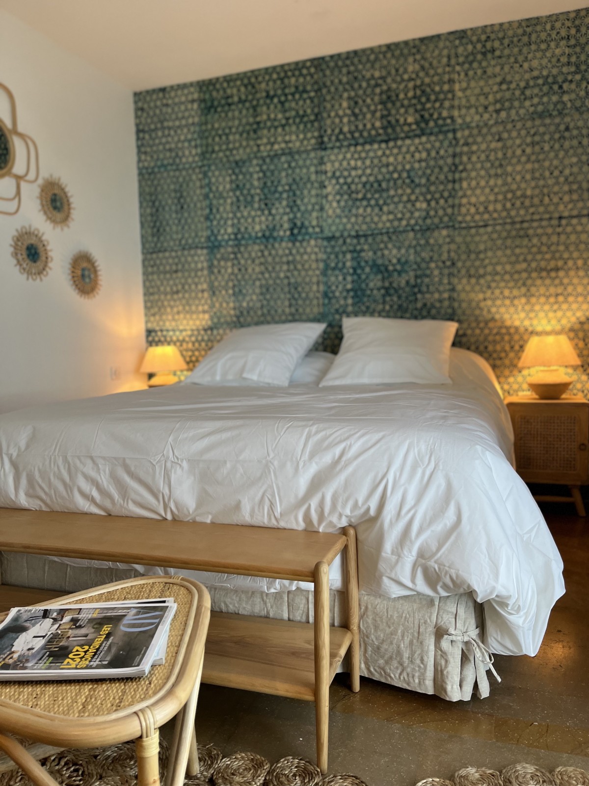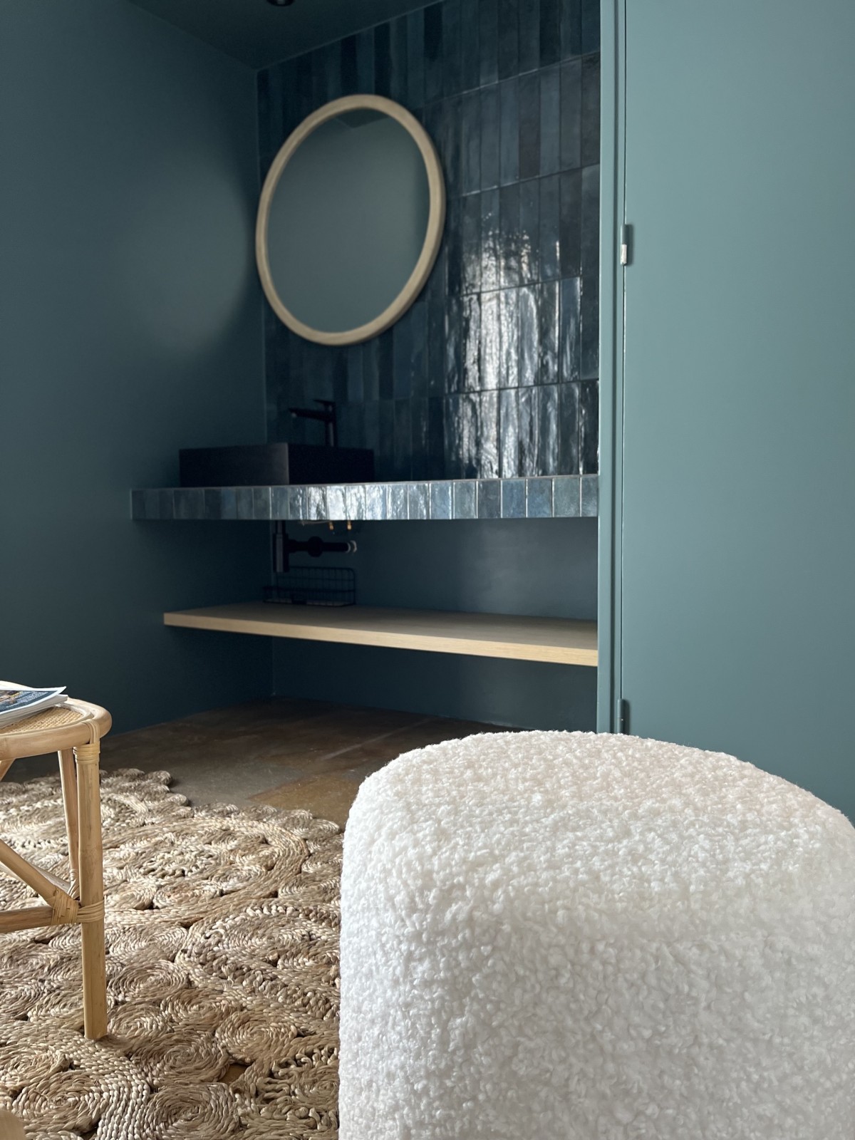 Le sol en pierre de Bali a été nettoyé et remis en valeur par le choix des éléments décoratifs réalisés par Cécile Le Ven , architecte d’intérieur talentueuse aux multiples facettes.