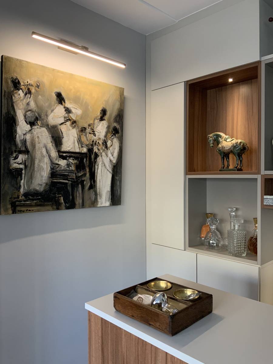 Les trésors procurés lors des voyages du couple trouvent leur voix dans cette rénovation. Des vases, masques et statues se transforment en œuvres d'art, habilement exposés dans des vitrines en verre rétro-éclairées. Des jeux de lumière subliment ces pièces, évoquant des souvenirs précieux dans chaque pièce de l'appartement.