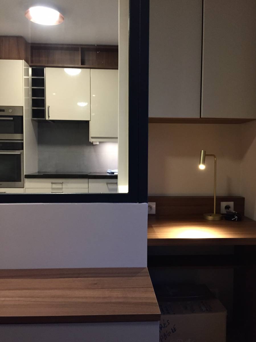 Une verrière, créée avec art par nos équipes de ferronniers, s'insinue comme une sculpture fonctionnelle. Elle sépare subtilement les espaces tout en préservant la fluidité visuelle, un délicat équilibre entre délimitation et cohésion.